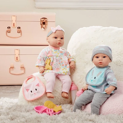 These darling twin baby dolls from Small WonderÂŽ by Madame AlexanderÂŽ are ready to be your babyâs babies! One doll wears an adorable floral tunic, pink leggings and a headband, while the other wears a blue and gray cloud print tee, legging and hat. These babies have molded heads, arms and legs and a weighted soft cloth body, so they feel so real to your child, encouraging lots of cuddles! Each doll has soft, beautiful light skin and sparkling blue eyes, ready for snuggling. Includes two bibs, two âmagicâ milk bottles, bowl, fork, spoon and cookies for a treat. Small WonderÂŽ by Madame AlexanderÂŽ dolls are made with âlove in the detailsâ to create a special bond with your child for years of fun, nurturing play.