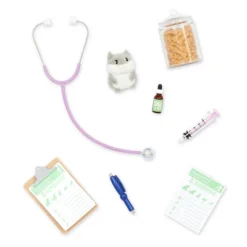 - Includes: 18-inch doll, scrubs top with cute animal prints, pleated skirt, undies, doctor’s coat, plush hamster, pair of shoes, stethoscope, clipboard, 2 medical forms, treats jar, pretend syringe, pen, and medicine bottle.