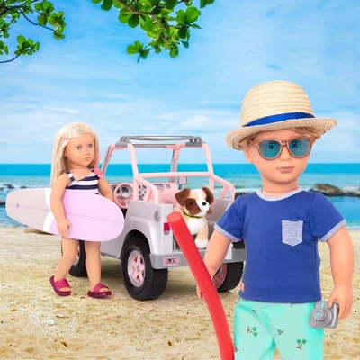 - Fun Features: functional lights and wipers, a surfboard, a removable roof rack, and comfortably fits 2 Our Generation dolls with their pet!