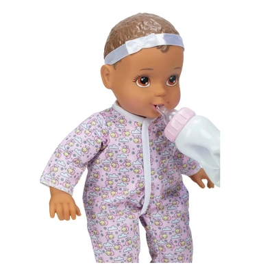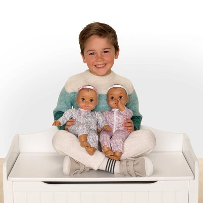 Your little one will adore doubling baby doll fun time with their very own set of Perfectly Cute 14” My Sweet Baby Doll identical TWINS! Dolls comes delightfully dressed in matching bumble bee printed onesies in pink and in white. Each My Sweet Baby twin features a soft’n’cuddly body with easy-to-wipe-clean, durable hard plastic arms, legs, & head. Coordinating pacifiers, bottles, pacifier clips & satin ribbon headbands also included! They’re the identically sweet addition to every baby doll collection!